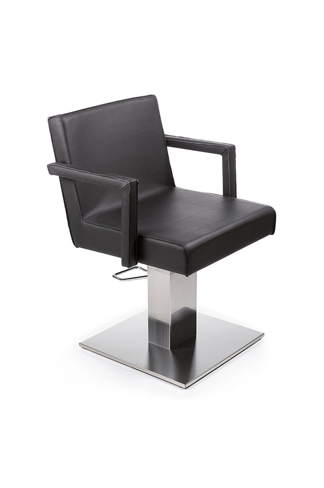 Friseurstuhl. Gestell aus Holz mit Polstermaterial aus PU-Schaumstoff und Bezug aus Echtleder wie abgebildet. Mit unterschiedlichen Fußvarianten aus Stahl erhältlich. Mit Pumpe und Blockierfunktion. Hier abgebildet mit der Fußvariante 19. Made in Italy